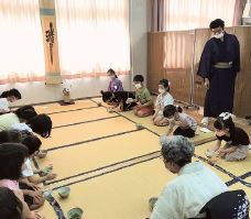 文化庁補助事業伝統文化親子教室として江南市の古知野西小学校で茶道こども教室(全10回)が始まり、小学生25人が前後半に分かれ、家族をもてなす11月の発表会に向け稽古に励んでいます。表千家教授の武田さんらを講師に、初稽古の3日は畳での歩き方や座り方、立ち方、お辞儀の仕方などからスタート。子どもたちは畳のヘリを踏まないように1帖を6歩で歩く、背中を伸ばし真っ直ぐ前を見て座りすっと立つなどポイントを教わりながら、繰り返し練習しました。